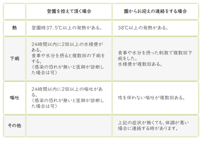 | 熱 | 登園時37.5℃以上の発熱がある。 | 38℃以上の発熱がある。 |